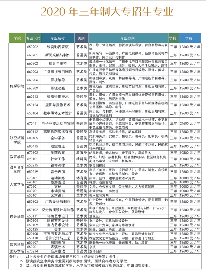 昆艺2020年三年制大专招生计划