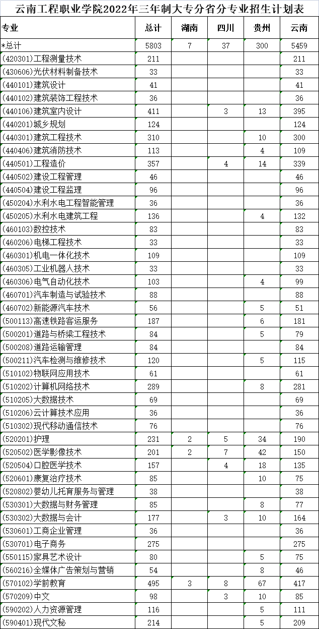 云南工程职业学院2022年三年制大专分省分专业招生计划