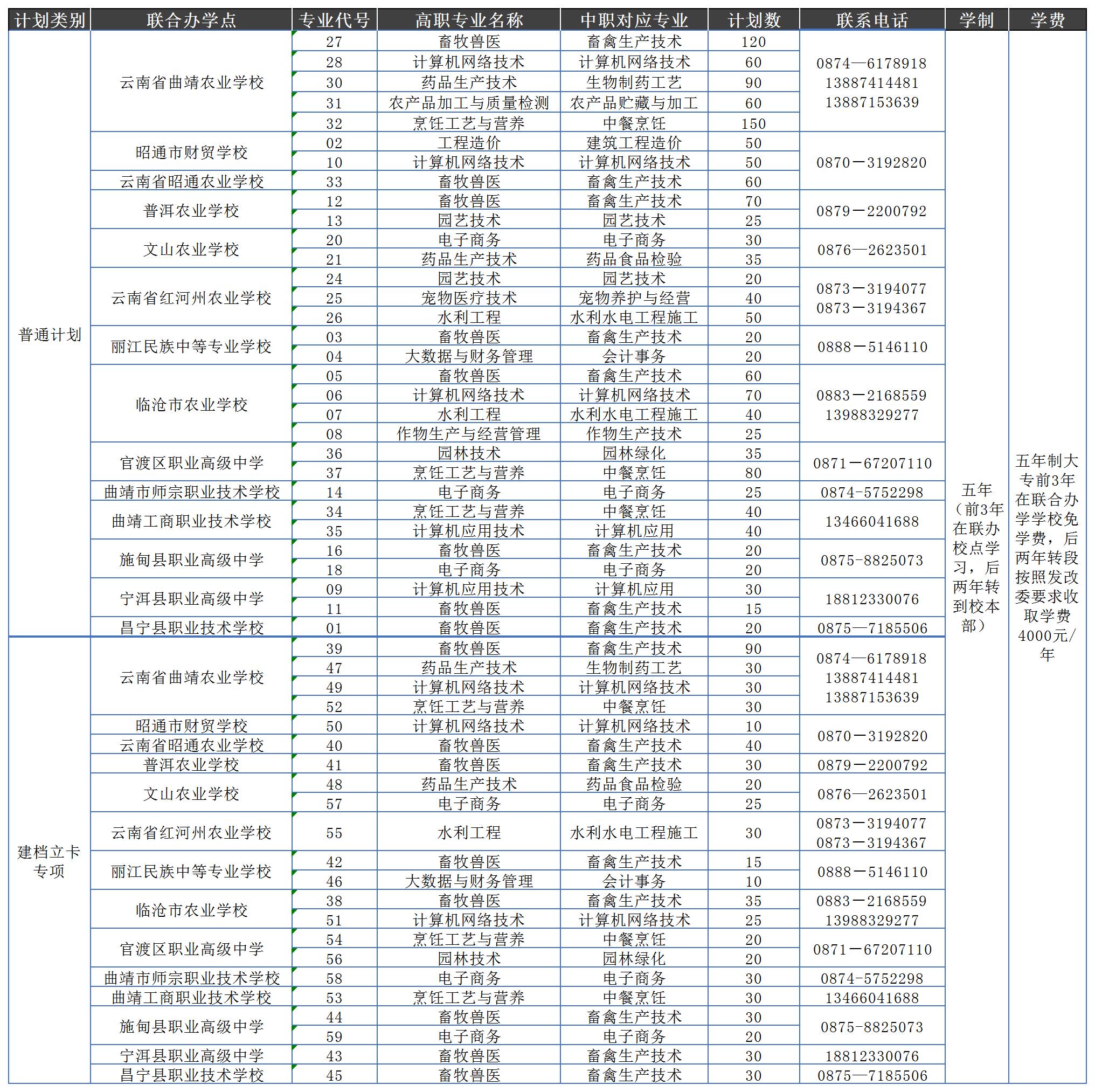 云南农业职业技术学院2022年五年制大专招生计划