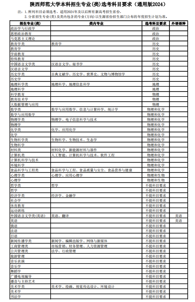 陕西师范大学本科招生专业(类)选考科目要求