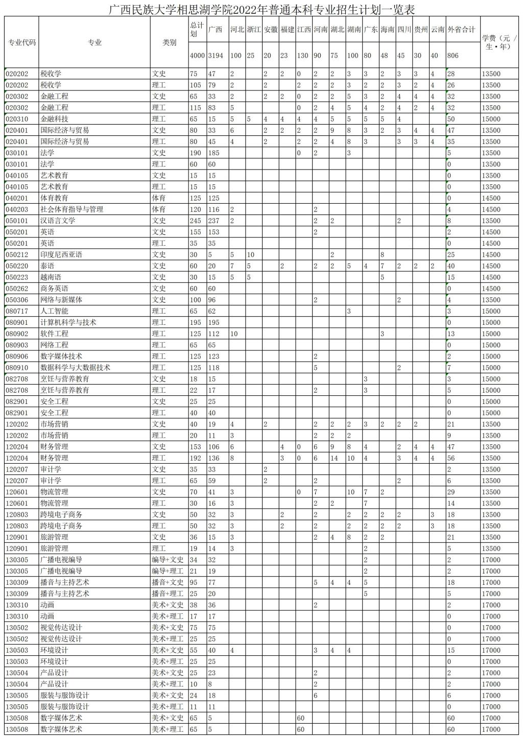 广西民族大学相思湖学院2022年普通本科专业招生计划一览表