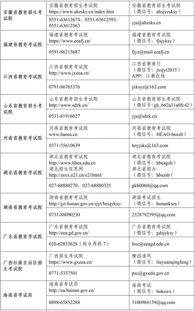 二是做好有关考生借考工作。考虑各地实际及有关考生关切,为帮助部分考生解决赴考的实际困难,对于当前仍滞留在报考点所在地以外省份且返回报考点确有困难的考生,可于12月8日上午8时至10日上午8时,登录“中国研究生招生信息网”(yz.chsi.com.cn),填写借考信息并提交申请。原报考点所在地省级教育招生考试机构协调相关省份审核通过后,统筹安排借考事宜。考生借考具体要求和办法请向原报考点所在地省级教育招生考试机构咨询(附各省级教育招生考试机构咨询电话和邮箱)。省域内借考事宜由各省级教育招生考试机构结合实际进行安排。
